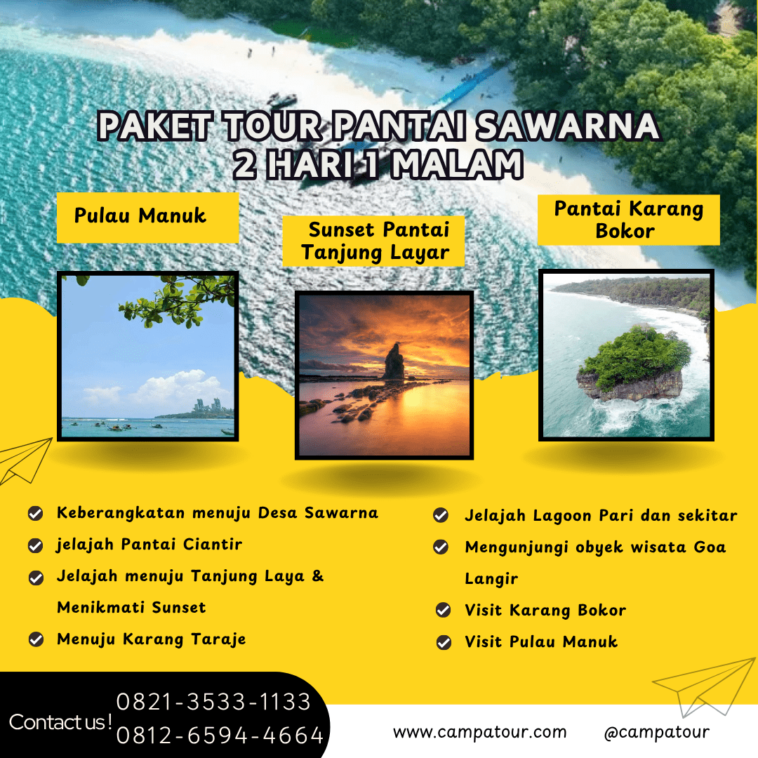 Bagaimana? Sudah terbayang serunya jalan-jalan ke Banten dan menikmati keindahan Sawarna? Jangan tunda lagi, segera daftar paket Wisata Pantai Sawarna 2 Hari 1 Malam (Grup) di Campa Tour untuk menikmati petualangan seru dan pengalaman yang tak terlupakan. Jangan lupa ajak teman-teman atau keluarga agar jalan-jalan ke pantai kawasan Sawarna semakin meriah.