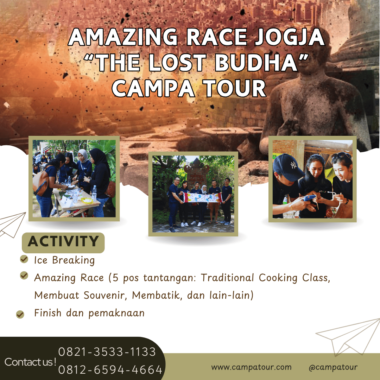 Aktivitas Amazing race di Jogja mempunyai banyak bermacam kegiatannya dan pilihan lokasinya. Campa tour & Event mempunyai beberapa konsep amazing race, salah satunya adalah “The Lost Budha” adapun scenario peserta adalah sebagai berikut:
