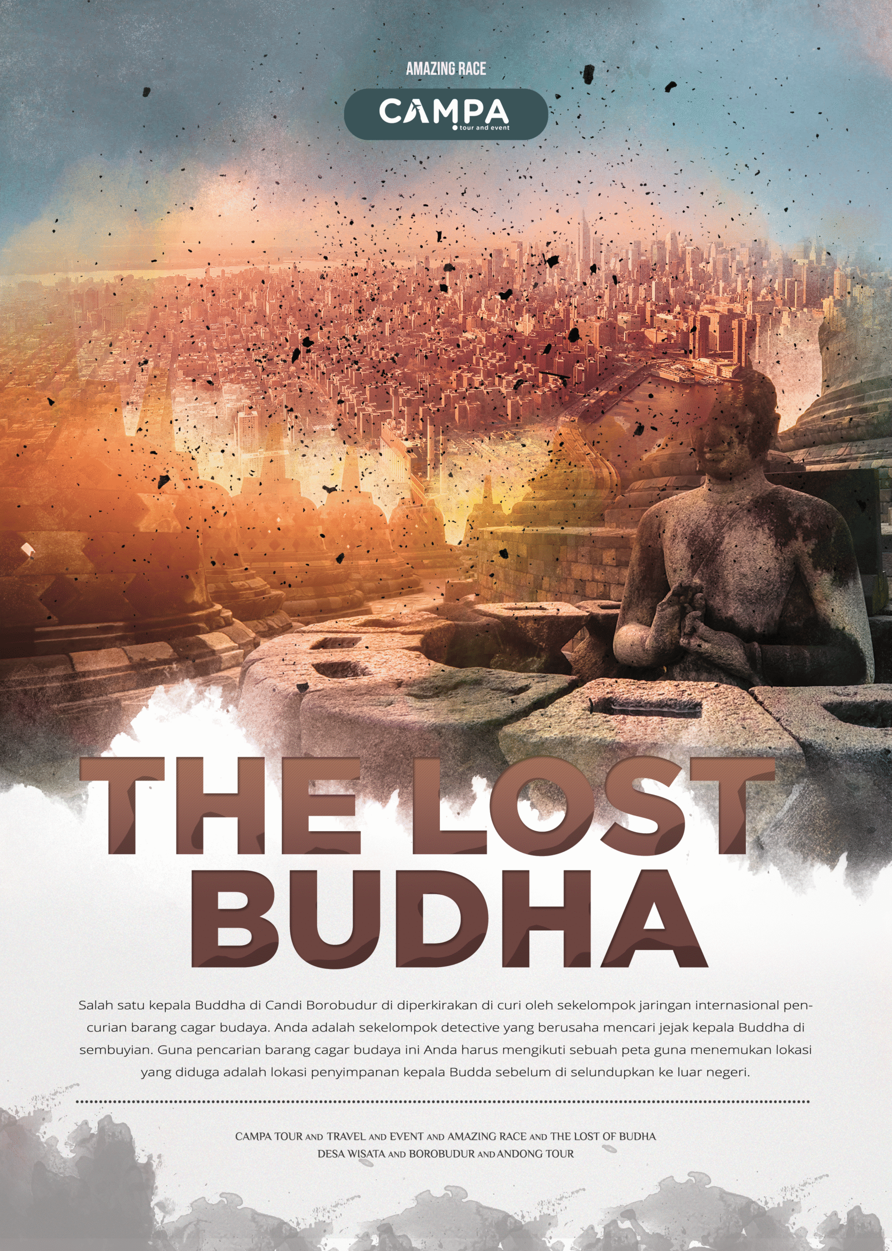 Aktivitas Amazing race di Jogja mempunyai banyak bermacam kegiatannya dan pilihan lokasinya. Campa tour & Event mempunyai beberapa konsep amazing race, salah satunya adalah “The Lost Budha” adapun scenario peserta adalah sebagai berikut: