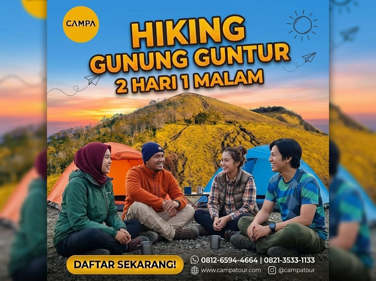 Bagaimana? ingin merasakan serunya petualangan hiking Gunung Guntung 2D1N ini? Jangan ragu untuk segera daftar Paket Hiking Gunung Guntur 2 Hari 1 Malam (2D1N) di Campa Tour. Oleh sebab itu, Kami akan mengurus semua keperluan pendakianmu, mulai dari perlengkapan camping, makanan selama pendakian, hingga pemandu yang berpengalaman. Kamu tinggal menikmati petualangan seru dan pemandangan alam yang memukau tanpa perlu repot mengurus persiapan. Hubungi Campa Tour sekarang juga dan jadwalkan petualanganmu menaklukkan keindahan Gunung Guntur untuk menjadi pengalaman hiking yang tak terlupakan bersama kami.