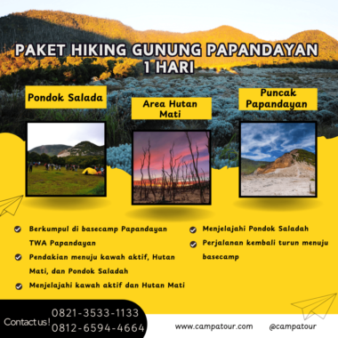 Paket Wisata Gunung Papandayan 1 Hari adalah layanan jasa tour guide lokal berpengalaman yang disedikan oleh tim Campa Tour bagi para pecinta alam yang ingin menikmati petualangan seru di Alam yang Memukau Gunung Papandayan. Gunung Papandayan menjadi destinasi ideal untuk petualangan sehari yang tak terlupakan dikarenakan keindahan alam yang menakjubkan dan jalur pendaian yang aman. Gunung Papandaya Garut sangat cocok untuk pendaki pemula yang ingin menikmati petualang seru merasakan sensasi trekking dan hiking dengan jalur yang menantang. Pendakian dari basecamp menuju Pondok Saladah biasanya membutuhkan waktu sekitar 3-4 jam.