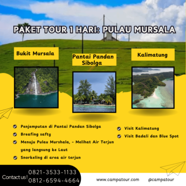 Paket Tour 1 Hari Pulau Mursala adalah pilihan terbaik untukmu yang ingin menikmati keindahan alam Sibolga tanpa repot. Dengan Campa Tour, semua kebutuhan perjalanan sudah diatur, mulai dari itinerary hingga transportasi. Dengan begitu, kamu bisa fokus sepenuhnya menikmati petualangan di Pulau Mursala, Air Terjun Mursala, Pulau Kalimatung, dan Pulau Badalu.