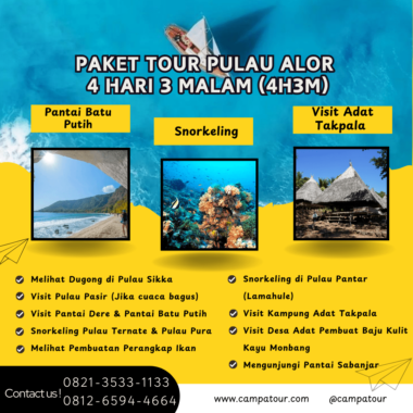 Paket Tour Pulau Alor 4 Hari 3 Malam ini menawarkan pengalaman liburan yang sempurna dalam waktu singkat. Anda akan merasakan langsung pesona alam bawah laut yang menakjubkan, mengunjungi desa adat dengan tradisi yang masih kental, serta menikmati aktivitas menarik seperti snorkeling, trekking, dan island hopping.
