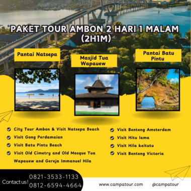 Paket Tour Ambon 2 Hari 1 Malam ini memberikan kesempatan untuk mengenal sejarah, budaya, dan keindahan alam Maluku secara padat dan terencana. Dalam waktu dua hari, Anda bisa menyaksikan perpaduan panorama pantai yang memukau, situs bersejarah yang penuh cerita, serta keramahan masyarakat lokal. Perjalanan ini tidak hanya meninggalkan foto-foto indah, tetapi juga kesan mendalam yang membuat Anda ingin kembali lagi ke Ambon.