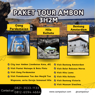 Paket Tour Ambon 3D2N menawarkan pengalaman luar biasa bagi para pecinta alam dan pelancong yang ingin menikmati keindahan alam Ambon, permata tersembunyi di Kepulauan Maluku. Dengan layanan pemandu wisata lokal yang berpengalaman dari Campa Tour, kamu akan menjelajahi destinasi wisata terbaik di Ambon, mulai dari pantai-pantai eksotis hingga situs-situs bersejarah yang kaya.
