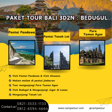 Paket Tour Bali 3 Hari 2 Malam (3H2M) Bedegul adalah layanan jasa tour guide yang disediakan oleh tim CampaTour bagi para pelancong yang ingin menjelajahi keindahan Bali Timur. Dengan layanan pemandu wisata lokal berpengalaman dari CampaTour, peserta akan mendapatkan pengalaman liburan yang tak terlupakan. Destinasi wisata di Bali sangat beragam, mulai dari tempat wisata alam yang menakjubkan hingga budaya yang kaya. Kamu bisa jalan-jalan ke pantai yang indah, air terjun, dan tempat menarik lainnya. Ayo, segera gabung dan daftar paket tour Bali 3 Hari 2 Malam (3H2M) Bedegul di CampaTour untuk menikmati keseruan petualangan yang menyenangkan dan pengalaman tak terlupakan.