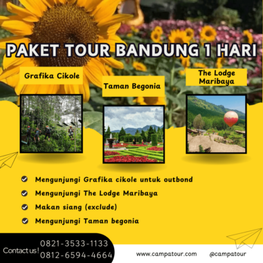 Paket tour Bandung 1 hari yang disediakan oleh Tim Campatour menjadi pilihan terbaik bagi pecinta alam atau petualangan yang ingin menikmati berbagai pesona Bandung dalam waktu yang singkat. Seperti keseruan Outbond Grafika Cikole, keindahan alam The Lodge Maribaya, hingga pesona bunga-bunga di Taman Begonia penuh warna.
