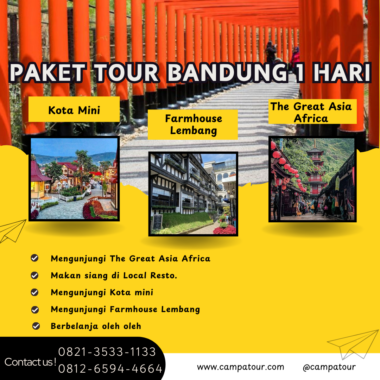 Ingin menikmati sejuknya udara Lembang sambil menjelajahi beragam tempat wisata menarik dalam satu hari penuh? Paket Tour Bandung 1 Hari dari Campa Tour menghadirkan pengalaman wisata lengkap ke The Great Asia Africa, Kota Mini, dan Farmhouse Lembang. Didesain khusus bagi wisatawan yang memiliki waktu terbatas namun tetap ingin merasakan keindahan Lembang, tour ini menawarkan perjalanan penuh kesan dalam durasi maksimal 12 jam.