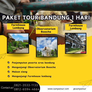 Paket Tour 1 Hari bersama Campa Tour memberikan kesempatan untuk mengunjungi dua destinasi wisata menarik di Bandung: Observatorium Bosscha dan Farmhouse Lembang. Dengan pemandu wisata profesional, perjalanan Anda di Bandung akan lebih menyenangkan tanpa harus repot merencanakan segala sesuatunya. Jika Anda merencanakan liburan di Bandung, segera daftar dan nikmati pengalaman wisata yang tak terlupakan bersama Campa Tour.