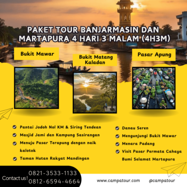 Paket Tour Banjarmasin dan Martapura 4 Hari 3 Malam (4H3M) dari Campatour menawarkan pengalaman seru yang menggabungkan keindahan alam dan budaya. Dengan pemandu wisata lokal berpengalaman, perjalanan ini tidak hanya akan memberikan kenangan tak terlupakan, tetapi juga kesempatan untuk mengeksplorasi berbagai destinasi menarik. Mulai dari hutan tropis yang asri hingga pasar terapung yang ikonik, setiap tempat yang kamu kunjungi akan meninggalkan kesan mendalam.