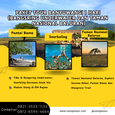 Banyuwangi sebagai surga wisata di ujung timur Pulau Jawa, menawarkan perpaduan keindahan laut, darat, dan alam liar yang memikat. Melalui Paket Tour Banyuwangi 1 Hari (Bangsring Underwater dan Taman Nasional Baluran), Campa Tour mengajak Anda menjelajahi dua destinasi populer yang menghadirkan pengalaman berbeda dalam satu hari penuh. Perjalanan singkat ini tetap sarat petualangan, mulai dari snorkeling bersama anak hiu hingga menikmati panorama savana yang menyerupai Afrika.