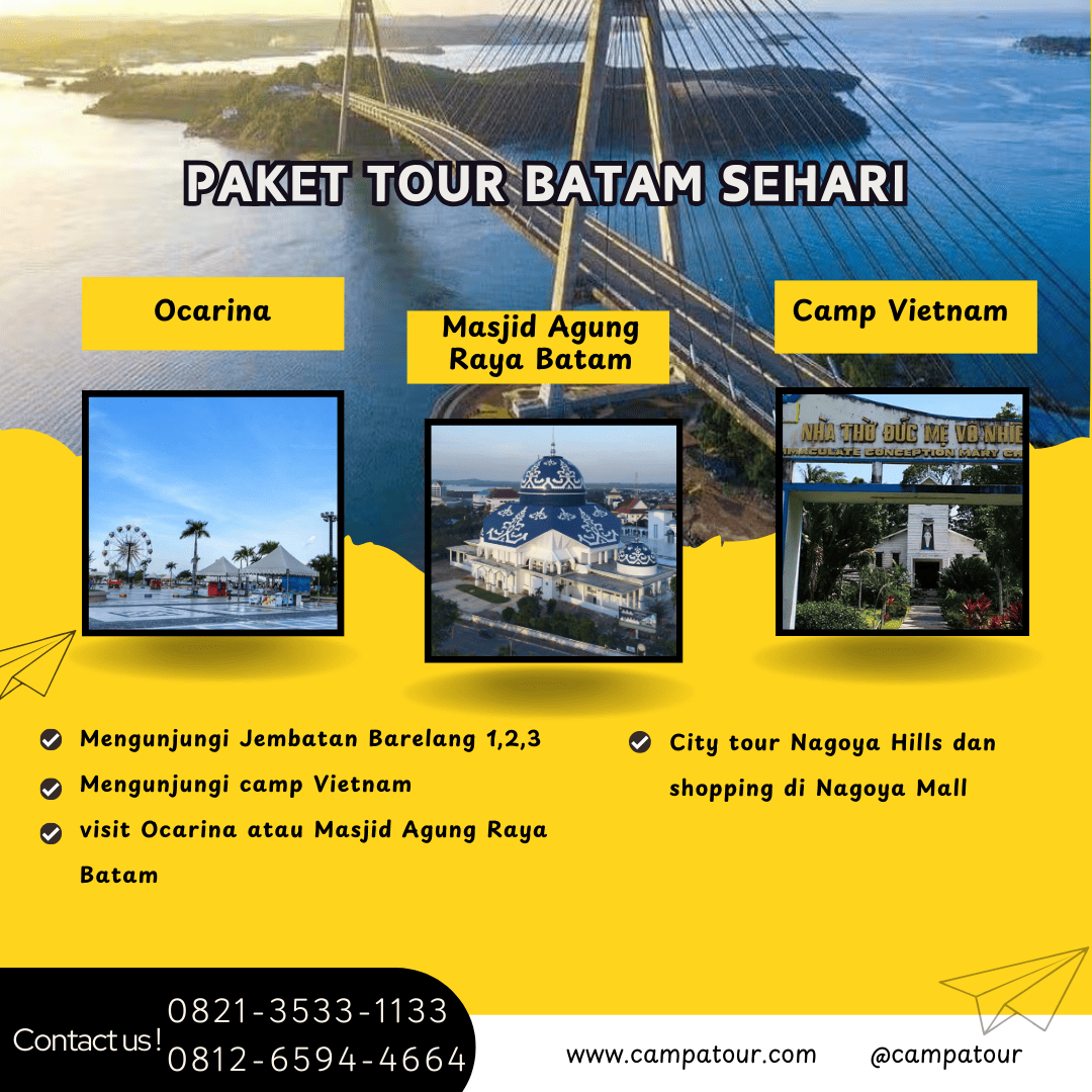 Paket Tour Batam ini memberikan pengalaman liburan yang penuh petualangan dan mengesankan. , perjalanan ini cocok untuk Anda yang mencari keindahan alam, sejarah, dan budaya dalam satu paket. Ayo segera daftar dan nikmati petualangan seru di Batam bersama Campa Tour!