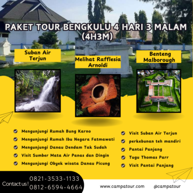 Segera rencanakan liburanTour Bengkulu 4 Hari bersama Campatour dan temukan berbagai destinasi wisata menarik di Bengkulu yang akan membawa Anda dalam petualangan seru. Hubungi kami sekarang untuk pemesanan dan informasi lebih lanjut. Kami siap menemani petualangan Anda dan menciptakan pengalaman yang tak terlupakan di Bengkulu!