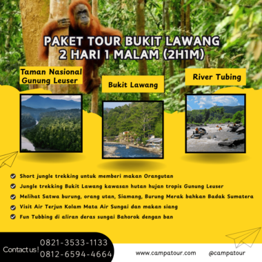 Paket Tour Bukit Lawang 2 Hari 1 Malam merupakan pilihan sempurna bagi Anda yang ingin menikmati petualangan di alam Sumatera Utara. Bersama tim pemandu wisata lokal dari Campa Tour, Anda akan menjelajahi keindahan Bukit Lawang, kawasan yang terkenal dengan habitat Orangutan Sumatera. Dalam tur ini, kemudian Anda akan melakukan jungle trekking, bertemu langsung dengan orangutan, menikmati air terjun kolam mata air sungai, serta merasakan sensasi river tubing di aliran deras Sungai Bahorok.