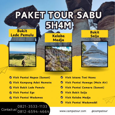 Campatour menyediakan layanan tour guide bagi para pelancong yang ingin menjelajahi keindahan alam dan budaya Pulau Sabu. Dalam paket ini, Anda akan didampingi oleh tour guide lokal yang berpengalaman, yang akan membawa Anda ke tempat-tempat wisata alam menakjubkan dan memberikan penjelasan mengenai keunikan setiap lokasi. Dengan mengikuti open trip ini, Anda juga berkesempatan bertemu teman baru dan berbagi pengalaman seru selama perjalanan. Segera daftar dan ikuti paket tour Festival Kelabba Madja dan Pulau Sabu 5D4N di Campatour untuk petualangan seru yang tak terlupakan.