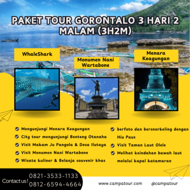 Jangan ragu untuk segera mendaftar pada Paket Tour Gorontalo dan Pulo Cinta 3D2N bersama Campa Tour dan nikmati liburan seru yang akan selalu Anda kenang!