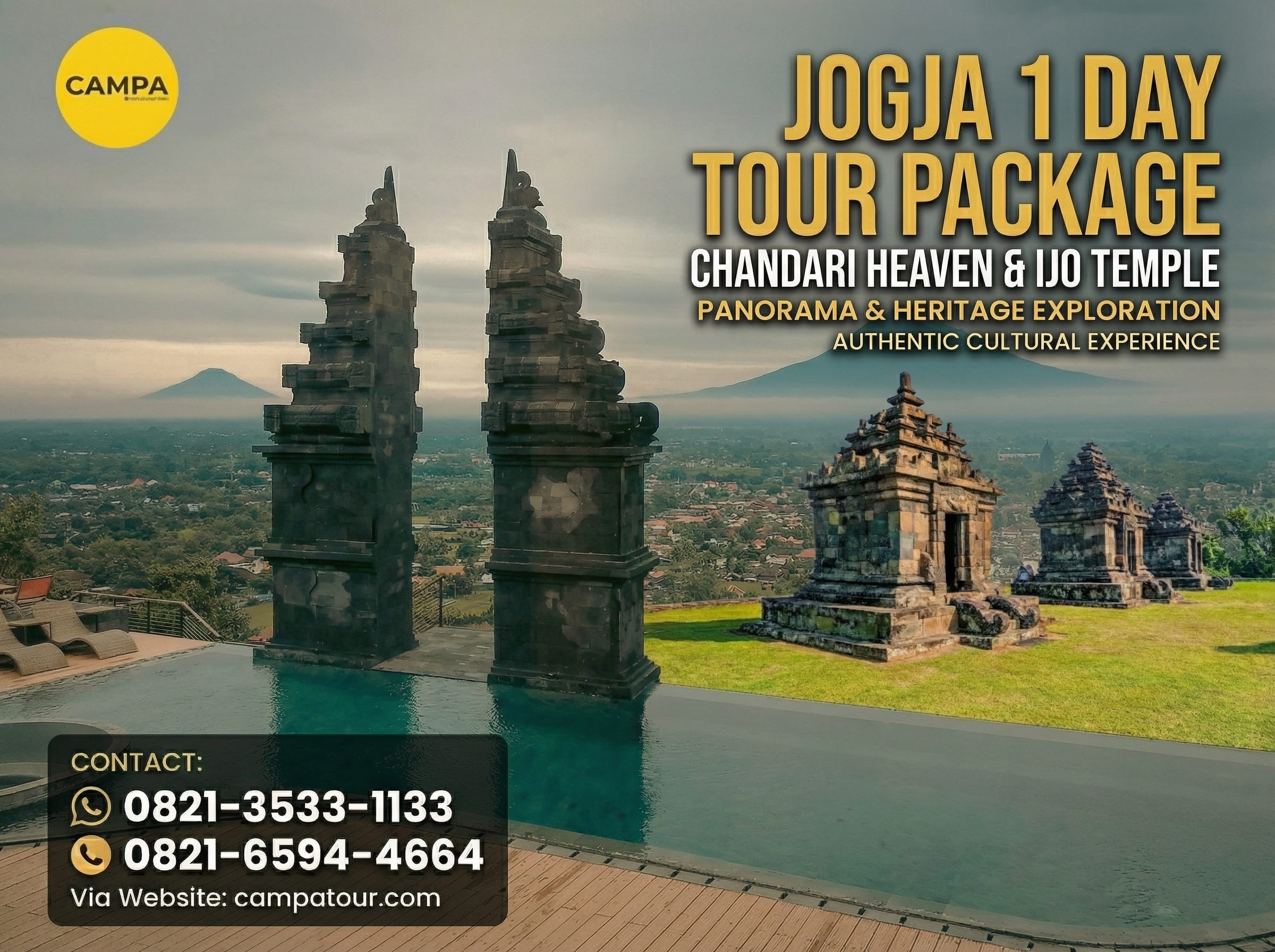 Paket Tour Jogja 1 Hari bersama Campa Tour memberikan kesempatan untuk menikmati keindahan alam Jogja yang memukau. Dari Chandari Heaven, Tebing Breksi, hingga Candi Ijo dan Obelix Hills, setiap tempat memiliki daya tarik dan keunikan tersendiri yang pastinya akan membuat liburanmu penuh warna. Oleh karena itu, jika kamu ingin merasakan pengalaman jalan-jalan seru di Jogja, ayo segera daftarkan diri dan ajak teman atau keluarga untuk mengikuti paket tour ini.