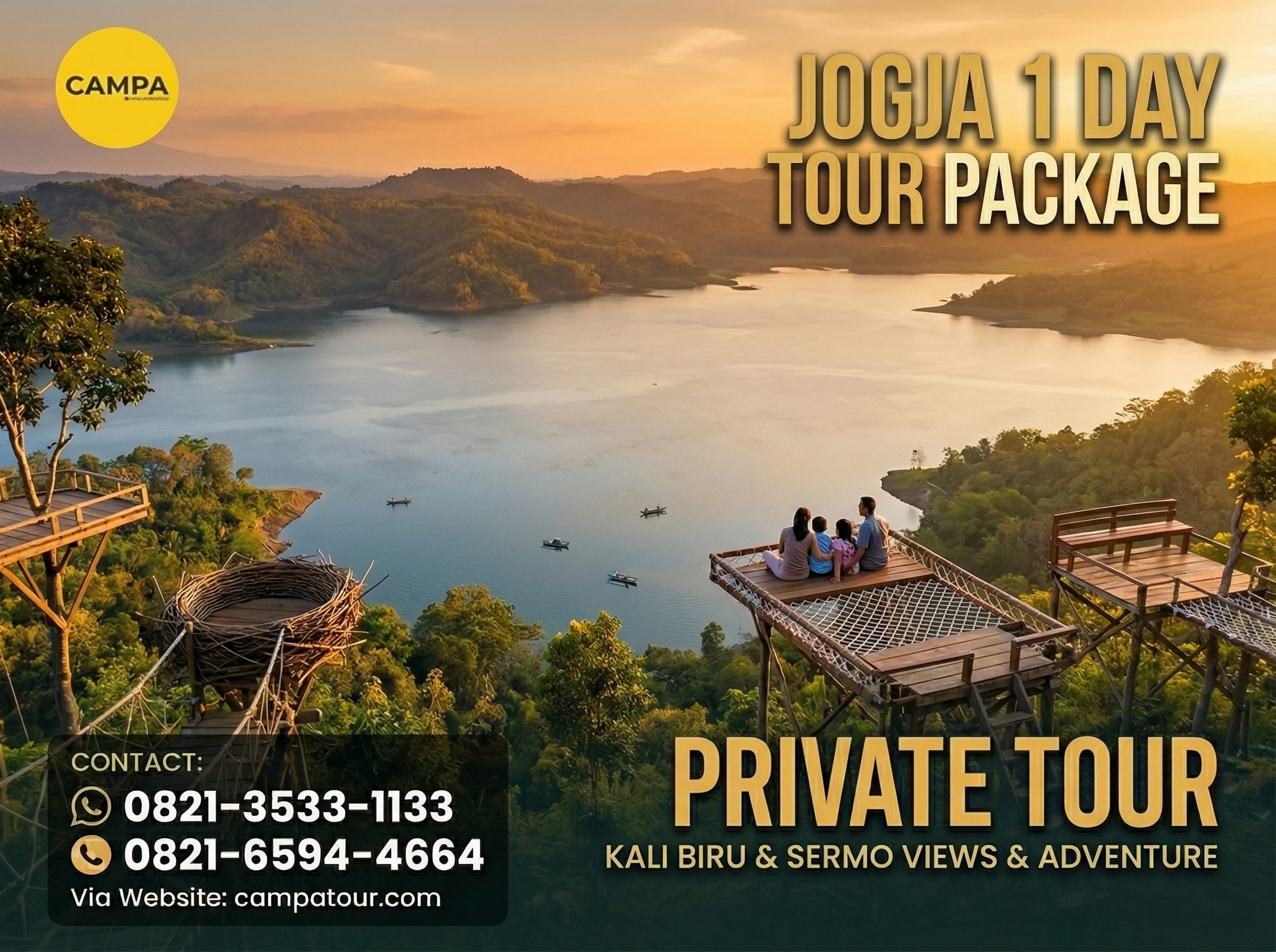 Siap untuk menjelajahi keindahan alam Jogja? Ayo, segera daftar untuk mengikuti Paket Tour Jogja 1 Hari bersama Campa Tour. Nikmati pengalaman seru yang akan mengubah cara pandangmu tentang Jogja. Tidak hanya itu, kamu juga bisa menikmati keindahan alam Kalibiru, Air Terjun Kembang Soka, dan Waduk Sermo bersama teman atau keluarga. Jangan lewatkan kesempatan untuk merasakan petualangan yang tak terlupakan!