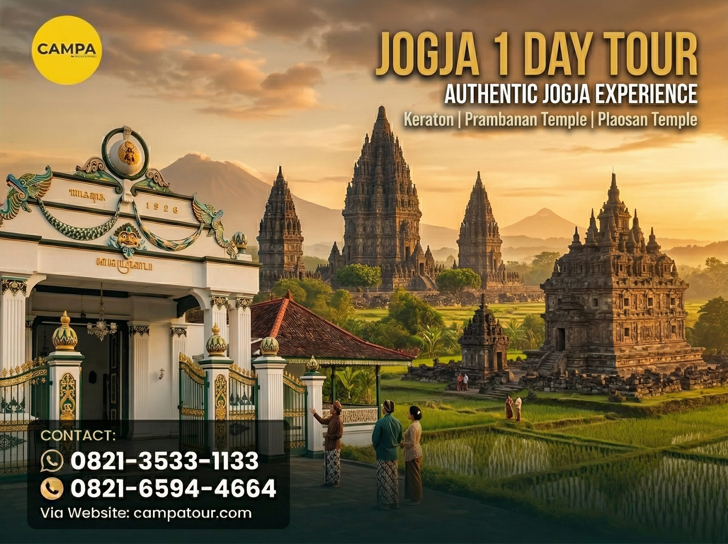 Jadi, jangan ragu untuk bergabung dalam Paket Tour Jogja 1 Hari dari Campa Tour. Ajak teman-teman atau keluargamu untuk menikmati liburan yang tak terlupakan di Jogja. Nikmati petualangan seru menjelajahi Keraton Yogyakarta, Candi Prambanan, Candi Plaosan, dan Tebing Breksi, yang semuanya akan memberikan pengalaman yang tak terlupakan!