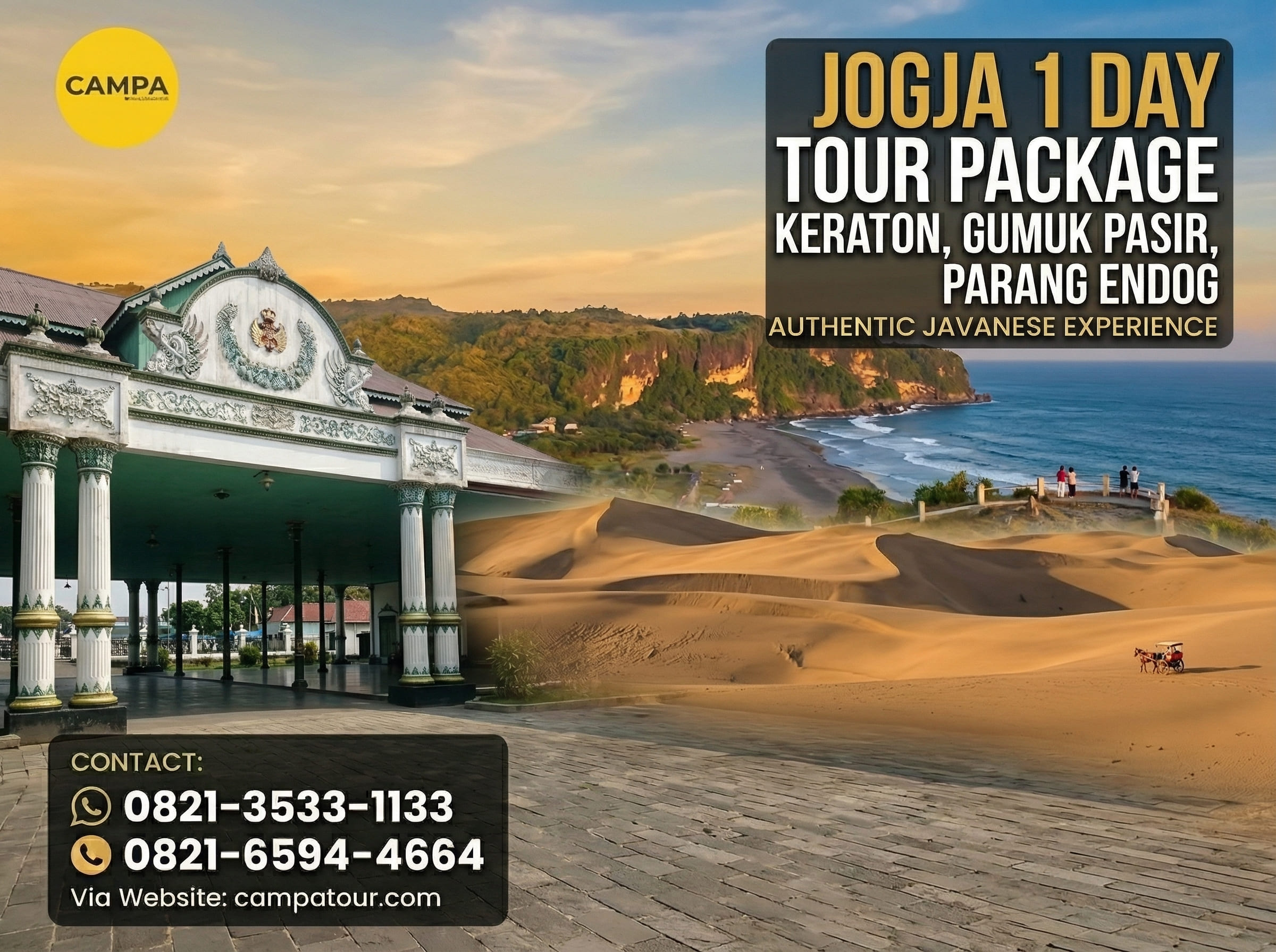 Paket Tour Jogja 1 Hari yang disediakan oleh Campa Tour memberikan kesempatan bagi para wisatawan untuk menikmati keindahan Yogyakarta dalam satu hari penuh. Yogyakarta adalah destinasi wisata yang populer, dengan berbagai daya tarik alam dan budaya. Jika kamu sedang merencanakan liburan ke Jogja, paket ini adalah pilihan tepat untuk menikmati berbagai tempat wisata ikonik yang tak terlupakan.