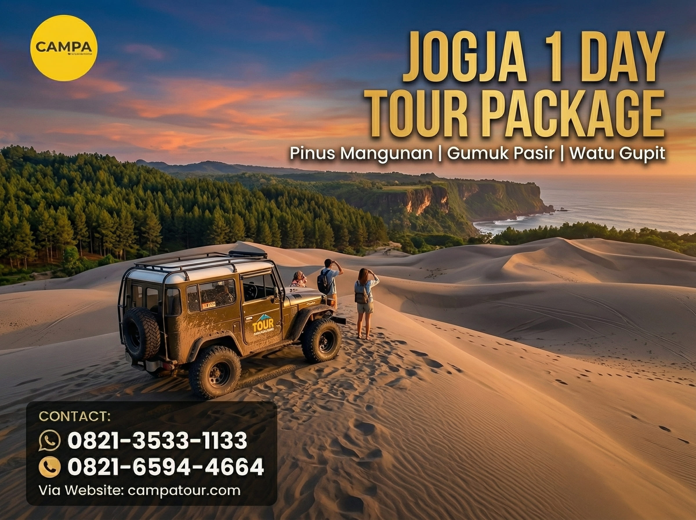 Paket Tour Jogja 1 Hari dari Campa Tour menawarkan pengalaman wisata yang tak terlupakan bagi kamu yang ingin mengeksplorasi keindahan alam Yogyakarta. Dengan demikian, perjalanan ini bukan hanya sekadar berkunjung ke tempat wisata, tetapi juga menikmati petualangan seru dengan berbagai destinasi alam yang menarik, seperti Hutan Pinus Mangunan, Gumuk Pasir Parangtritis, dan Bukit Paralayang Watu Gupit. Setiap tempat menawarkan pemandangan yang eksotis dan aktivitas seru yang akan membuat liburanmu semakin istimewa.