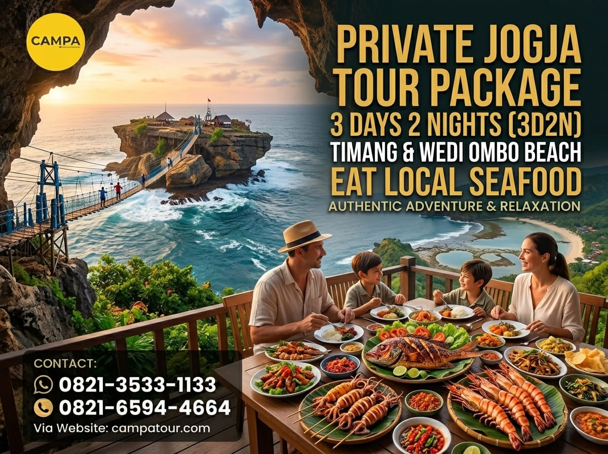 Tour Jogja 3 Hari kali ini adalah destinasi wisata yang tidak biasa atau anti maintream. Hari pertama kami akan mengajak Anda berkulineran masakan jawa di kopi prambanan dengan konsep prasmanan. selanjutnya Anda akan kami ajak mengunjungi situs Candi Plaosan Lor yang mempunyai spot foto yang bagus. Selanjutnya kami akan mengajak anda explorasi candi Ijo untuk melihat megahnya sunset dari atas bukit sehingga anda merasa seolah diatas awan merah. Selanjutnya kami ajak anda menikmati mbak mie Jowo Mbah Gito yang legendaris. Tour Jogja berikutnya kami akan mengajak anda berpetualangan di beberapa destinasi unggulann Jogja diantaranya adalah Pantai Pulau Timang. Pulau Timang ini unik karena mempunyai pulau yang disebrangi dengan ganthole atau jembatan. Anda bisa beradu nyali melintasinya. selanjutnya adalah Pantai Wedi Ombo sebuah pantai unik dengan kolam alaminya yang anda bisa nikmati seolah di invinity pool milik hotel berbintang 5 di bali.