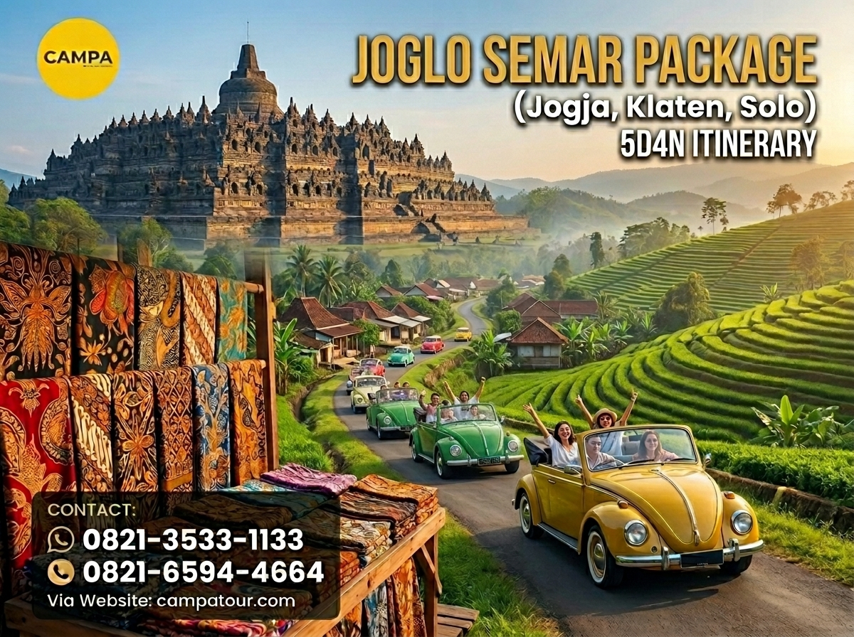 Paket Tour Joglo Semar (Jogja–Klaten–Solo–Karanganyar) 5H4M menghadirkan perjalanan lengkap yang memadukan wisata budaya, alam, petualangan, hingga kuliner khas Jawa Tengah dalam satu rangkaian yang nyaman dan berkesan. Sejak awal kedatangan, Campa Tour menyambut Anda di hotel atau bandara dengan layanan profesional dan ramah, lalu langsung mengajak Anda memulai eksplorasi menuju kawasan Magelang yang sarat sejarah dan panorama pedesaan yang asri.