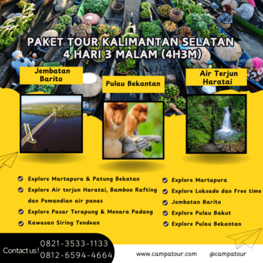 Segera rencanakan liburanmu bersama Campa Tour dan nikmati petualangan seru di Kalimantan Selatan! Hubungi kami untuk informasi lebih lanjut dan dapatkan penawaran terbaik untuk paket wisata Kalimantan Selatan.