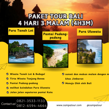 Paket Tour Keluarga Bali 4H3M adalah layanan jasa tour guide yang disediakan oleh tim Campatour bagi para pelancong yang ingin menikmati keindahan Pulau Bali. Dengan pemandu wisata lokal yang berpengalaman, Anda akan menjelajahi berbagai destinasi wisata Bali yang menarik, dari tempat wisata alam yang menakjubkan hingga lokasi penuh budaya. Kami juga menyediakan open trip yang menyenangkan dan mengesankan. Mari bergabung dengan kami dalam perjalanan keluarga selama 4 hari 3 malam di Bali, yang dirancang khusus untuk memberikan pengalaman terbaik menjelajahi keindahan Pulau Dewata.