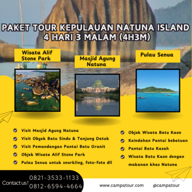 Ayo, segera gabung dan daftar untuk mengikuti Paket Tour Kepulauan Natuna 4D3N dari Campatour. Nikmati petualangan seru menjelajahi keindahan alam dan destinasi wisata di Kepulauan Natuna yang memukau, ditemani oleh tour guide profesional yang ramah. Rasakan sendiri pesona destinasi wisata Kepulauan Natuna yang akan membuat Anda jatuh cinta. Hubungi kami sekarang juga!