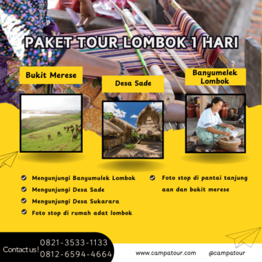 Paket Tour Lombok 1 Hari: Banyumulek, Desa Sade dan Sukarara adalah layanan jasa tour guide lokal berpengalaman yang disediakan oleh tim Campa Tour bagi para pecinta alam yang ingin menikmati petualangan seru di Lombok. Selain itu, bagi kamu yang sedang merencanakan liburan di Lombok atau mencari tempat wisata di Lombok yang anti-mainstream, selain itu, kamu bisa bergabung bersama tim Campa Tour dan mengikuti paket Tour Lombok 1 hari di Lombok yang tak terlupakan. Selain itu, paket ini akan membawamu menjelajahi tempat wisata alam Lombok yang terkenal, seperti Desa Banyumulek, Desa Sade, dan Sukarara.