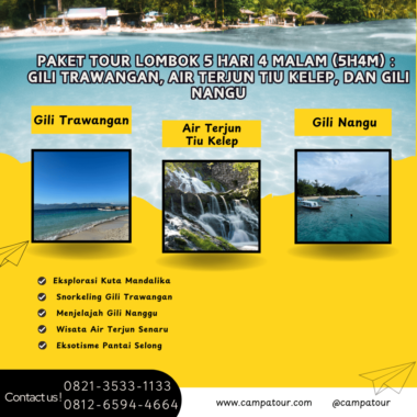 Paket Tour Lombok 5 Hari 4 Malam menghadirkan kombinasi sempurna antara wisata laut, air terjun, budaya lokal, dan kuliner khas daerah. Dengan itinerary yang padat namun fleksibel, Anda dapat menikmati banyak destinasi tanpa merasa terburu-buru. Mulai dari snorkeling di Gili Trawangan hingga merasakan semilir air terjun di kaki Gunung Rinjani, semuanya tersedia dalam satu paket. Inilah saat yang tepat untuk menjelajah sisi terbaik dari Pulau Lombok.