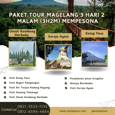 Paket Tour Magelang 3H2M (3 Hari 2 Malam) akan menjelajahi beberapa tempat destinasi wisata alam di Magelang bersama pemandu tour guide tim Campatour. Liburan di Magelang bersama kami akan menjadi sebuah pengalaman yang lebih mengesangkan hingga tak terlupakan. Jalan-jalan ke Magelang kita akan berpetualangan menikmati keindahan puncuk gunung Telomoyo, Silancur Highland, Nepal Van Java dan Desa Sukomakmur hingga Borobudur. Yuk, segera gabung dan daftar paket tour Magelang 3 hari 2 malam di Campatour melalui situs website resmi atau menghubungi nomor telepon customer service kami.