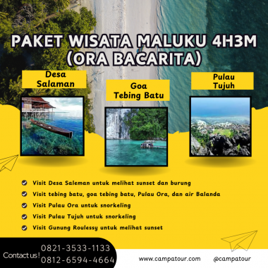 Paket ini menawarkan pengalaman yang lengkap untuk menikmati keindahan alam, sejarah, dan budaya Maluku. Dengan pelayanan yang ramah dan profesional dari tim Campa Tour, Anda akan mendapatkan pengalaman wisata yang tak terlupakan. Jadi, jangan ragu lagi, segera hubungi Campa Tour dan booking paket wisata ini untuk memulai petualangan Anda.