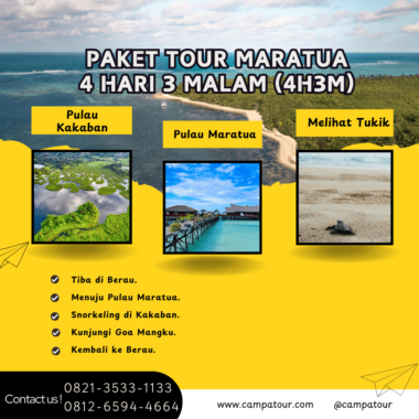 Paket Tour Maratua 4 Hari 3 Malam bersama Campatour menawarkan pengalaman luar biasa dengan pemandu wisata berpengalaman. Jelajahi berbagai destinasi menakjubkan seperti Pulau Maratua, Pulau Kakaban, Pulau Sangalaki, Kehe Daing, dan Goa Haji Mangku. Dengan menggunakan jasa pemandu wisata lokal dari Campatour, kamu akan mendapatkan pengalaman tak terlupakan dan informasi menarik sepanjang perjalanan. Selain itu, kamu akan merasakan kenyamanan dalam setiap langkah perjalanan yang kami tawarkan. Ajak teman-teman dan keluarga untuk bergabung dalam petualangan seru ini!