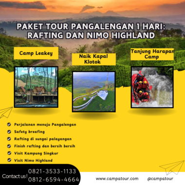 Paket Tour Pangalengan 1 Hari: Rafting dan Nimo Highland dirancang untuk Anda yang ingin menikmati sisi petualangan sekaligus ketenangan alam Bandung Selatan. Dalam waktu singkat, Anda dapat merasakan sensasi rafting yang mendebarkan, bersantai di alam terbuka, dan menikmati panorama luar biasa di atas bukit teh.