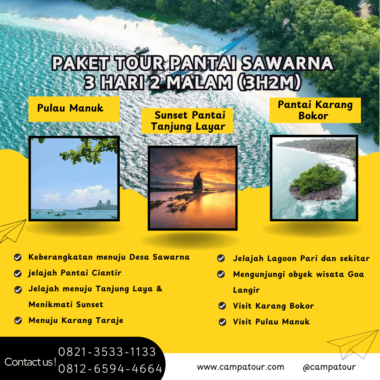 Bagi Anda yang mendambakan liburan bernuansa alam dengan keindahan pantai yang masih alami, Paket Tour Sawarna 3 Hari 2 Malam (3H2M) adalah pilihan sempurna. Desa wisata ini terkenal dengan keindahan pantainya yang menawan, tebing-tebing karang megah, serta suasana pedesaan yang menenangkan. Dalam perjalanan ini, Anda akan menjelajahi berbagai destinasi menakjubkan, mulai dari Pantai Ciantir hingga Tanjung Layar yang ikonik, serta merasakan pengalaman santai di penginapan yang nyaman.