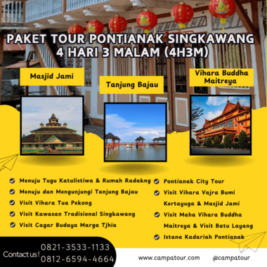 Ayo, segera rencanakan liburan di Pontianak dan Singkawang bersama tim Campa Tour selama 4 hari 3 malam untuk menjelajahi tempat wisata alam Pontianak Singkawang dan seluruh pesona Kalimantan Barat! Selain itu, dengan berbagai pilihan wisata yang sudah dirancang untuk Anda, perjalanan ini akan menjadi pengalaman tak terlupakan. Kemudian, Anda akan dipandu oleh tim pemandu wisata yang berpengalaman, memastikan perjalanan Anda nyaman dan menyenangkan.
