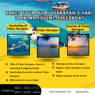 Jika Anda mendambakan liburan singkat penuh keindahan laut tropis, Paket Tour Pulau Harapan 3 Hari 2 Malam (3H2M) bersama Campa Tour adalah pilihan tepat. Terletak di gugusan Kepulauan Seribu, Pulau Harapan menawarkan panorama laut biru jernih, gugusan pulau kecil yang memesona, dan suasana tenang jauh dari hiruk-pikuk kota. Dalam tiga hari, Anda akan menikmati perpaduan petualangan laut, keindahan bawah air, dan kehangatan malam di pulau.