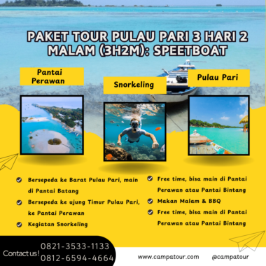 Pulau Pari di Kepulauan Seribu menjadi destinasi favorit bagi wisatawan yang mencari keindahan alam tropis tanpa harus bepergian jauh dari Jakarta. Dengan pasir putih yang halus, air laut sebening kristal, dan panorama matahari terbenam yang memesona, pulau ini menghadirkan suasana tenang dan menyegarkan. Melalui Paket Tour Pulau Pari 3 Hari 2 Malam (3H2M) dengan Speedboat, Anda akan menikmati perjalanan cepat, nyaman, serta serangkaian aktivitas seru yang membangkitkan semangat liburan.