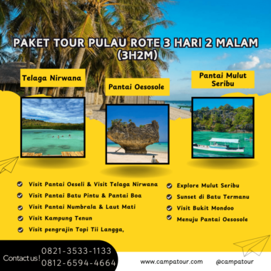 Tertarik untuk menjelajahi Pulau Rote? Jangan tunggu lagi! Daftar sekarang untuk Paket Tour Pulau Rote 3D2H bersama Campa Tour. Nikmati pengalaman seru, kunjungi tempat-tempat indah, dan buat liburanmu menjadi tak terlupakan. Hubungi kami untuk informasi lebih lanjut dan pemesanan.