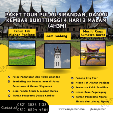 Paket Tour Pulau Sirandah, Danau Kembar Bukittinggi 4 Hari 3 Malam (4H3M)- Jelajah Sumatera Barat menawarkan lebih dari sekadar destinasi wisata biasa. Dalam paket tour selama 4 hari 3 malam ini, Anda akan dibawa menyusuri pesona bahari Padang, eksotisme danau kembar di Alahan Panjang, hingga kekayaan budaya Minangkabau di Bukittinggi dan sekitarnya. Perjalanan ini tak hanya menyegarkan mata, tetapi juga memperkaya jiwa.