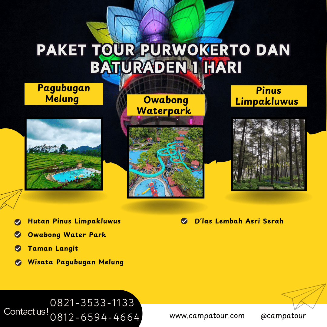 Paket Tour Purwokerto dan Baturaden 1 Hari adalah pilihan tepat bagi Anda yang ingin berlibur singkat namun tetap mendapatkan pengalaman lengkap. Dengan itinerary yang terencana dan pemandu profesional, Anda dapat menikmati wisata alam, budaya, hingga kuliner khas Banyumas dalam satu perjalanan yang nyaman dan menyenangkan.