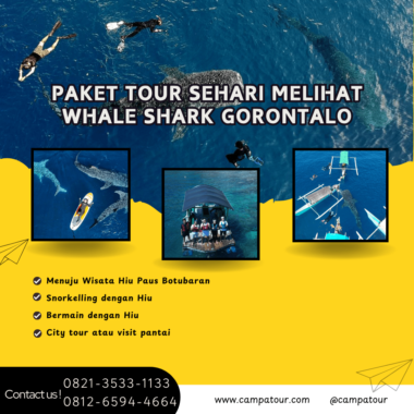 Paket Tour Sehari Melihat Whale Shark Gorontalo adalah layanan jasa tour guide lokal berpengalaman yang disedikan oleh tim Campa Tour bagi para pecinta alam yang ingin menikmati petualangan seru yang tak terlupakan melihat hiu paus di Botubarani. Bagi kamu yang sedang merencanakan liburan di Gorontalo yang tak terlupakan atau mencari tempat wisata di Gorontalo pengalaman mengesankan, kamu bisa gabung dan daftar mengikuti paket tour sehari melihat Whale Shark Gorontalo di Campa Tour untuk menikmati liburan di wisata hiu paus Botubarani, sebuah permata tersembunyi di Sulawesi yang dikenal keindahan bawah lautnya memukau.