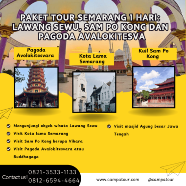 Paket Tour Semarang 1 Hari adalah pilihan yang sangat tepat bagi Anda yang ingin menjelajahi berbagai destinasi wisata menarik di Semarang dalam waktu singkat. Dengan demikian, Campatour menyediakan pemandu berpengalaman yang siap menemani Anda sepanjang perjalanan, memberikan pengetahuan menarik tentang setiap tempat yang dikunjungi. Selain itu, perjalanan ini juga memberi kesempatan untuk mengeksplorasi berbagai lokasi yang kaya akan sejarah dan keindahan alam yang luar biasa.