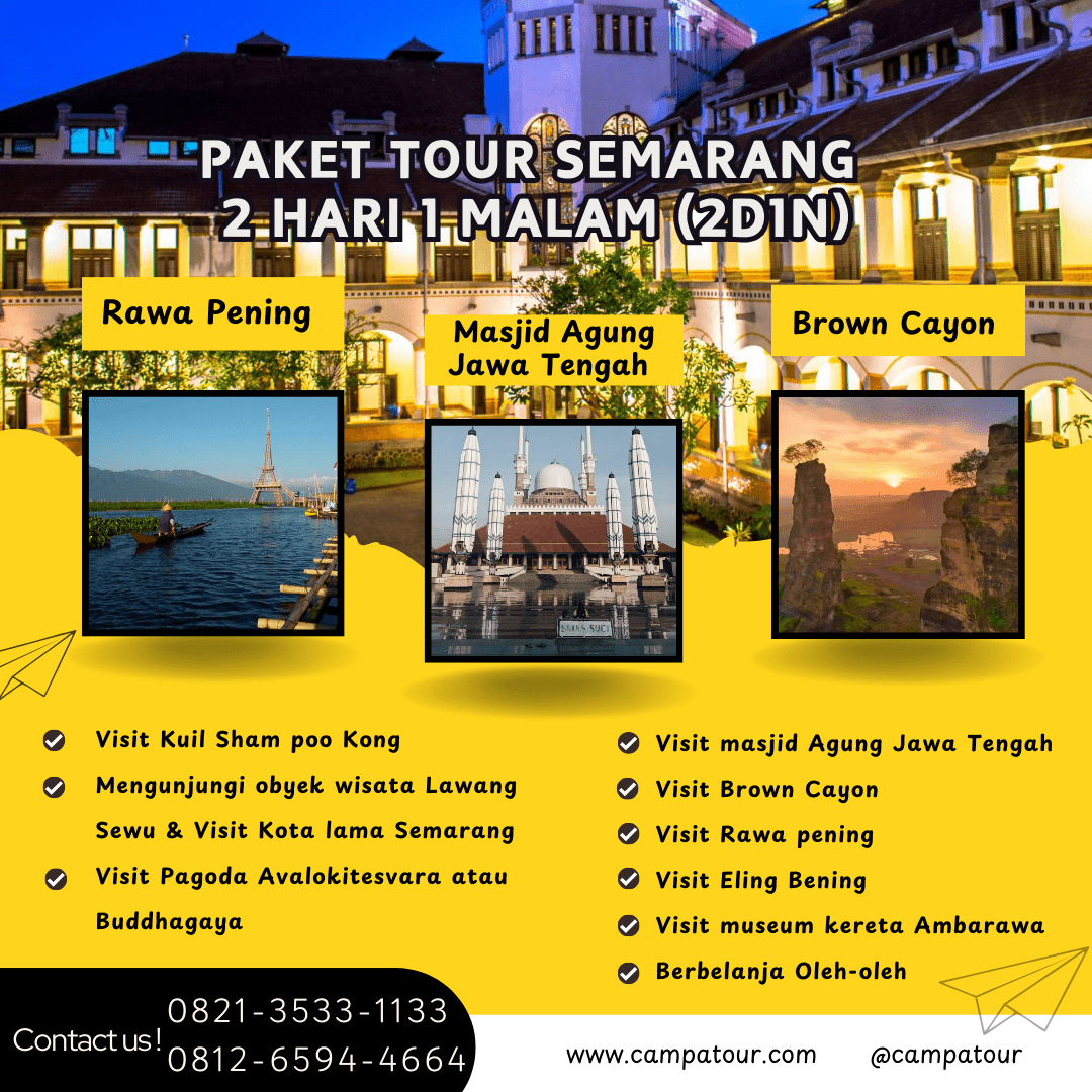 Paket Tour Semarang 2 Hari 1 Malam (2D1N): City Tour & Brown Canyon – Semarang, sebagai salah satu ibukota di Jawa Tengah, Indonesia, kaya akan warisan budaya, sejarah, dan keindahan alam. Paket Tour Semarang 2 Hari 1 Malam menawarkan kesempatan untuk mengeksplorasi destinasi wisata menarik, menikmati kuliner khas, dan membeli oleh-oleh yang tak boleh terlewatkan. Dengan bantuan pemandu berpengalaman dari Campatour, perjalanan Anda akan menjadi lebih menyenangkan dan tak terlupakan.