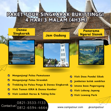 Paket Tour Singkarak Bukittinggi 4 Hari 3 Malam (4H3M) adalah pilihan sempurna untuk Anda yang ingin menikmati keindahan alam dan kekayaan budaya Sumatera Barat. Selama perjalanan ini, Anda akan merasakan pengalaman tak terlupakan yang menggabungkan wisata alam, sejarah, dan kuliner. Segera daftarkan diri Anda dan nikmati petualangan seru bersama Campa Tour! Jangan ragu untuk menghubungi kami untuk informasi lebih lanjut dan pemesanan paket wisata.