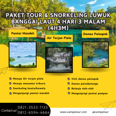 Paket Tour Snorkeling Luwuk Banggai Laut 4D3N adalah layanan tur yang ditawarkan oleh tim Campa Tour bagi para pecinta alam dan pelancong yang ingin menikmati keindahan alam di Luwuk Banggai. Dengan bantuan pemandu wisata lokal yang berpengalaman, perjalanan ini akan membawa Anda ke berbagai destinasi wisata spektakuler, seperti pantai, air terjun, dan taman bawah laut yang indah. Oleh karena itu, liburan di Luwuk Banggai menjadi kesempatan sempurna untuk bersantai dan menikmati waktu berkualitas bersama teman atau keluarga. Selain itu, keindahan alam yang luar biasa akan memanjakan mata Anda sepanjang perjalanan.