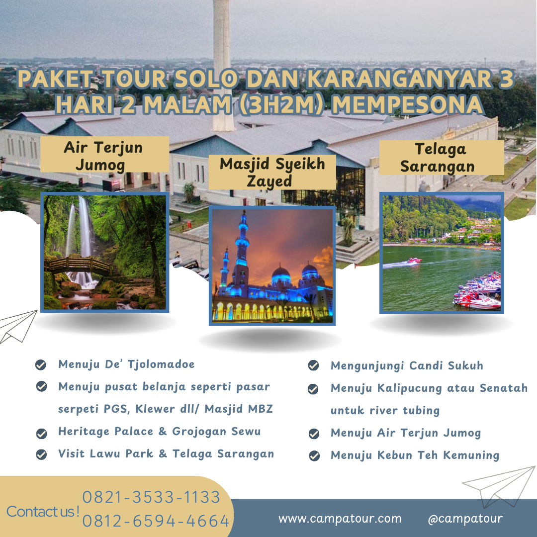 Paket Tour solo 3 Hari ini memberikan Anda kesempatan untuk menikmati keindahan alam, budaya, serta kuliner khas Solo. Dengan bantuan tim pemandu berpengalaman dari Campatour, Anda akan diajak trekking, hiking, dan mengeksplorasi berbagai destinasi menarik. Mulai dari kebun teh Kemuning hingga Masjid MBZ, perjalanan ini akan menjadi pengalaman yang tak terlupakan.