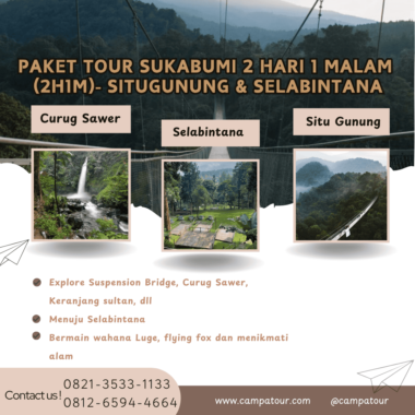 Berlibur sejenak dari kesibukan kota besar kini lebih mudah dengan Paket Tour Sukabumi 2 Hari 1 Malam (2H1M). Perjalanan ini menggabungkan dua destinasi unggulan di Sukabumi, yaitu Geopark Situ Gunung yang memesona dan Selabintana yang menawarkan pengalaman alam sekaligus aktivitas seru. Dalam waktu singkat, Anda bisa menikmati suasana pegunungan, melintasi jembatan gantung, bermain di tengah alam, hingga bersantai sambil menghirup udara segar.